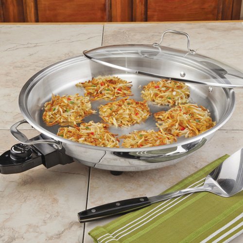 Reviews for CucinaPro 1453 Stainless Steel Round Classic Electric Skillet 12 Inch (Kitchen) I'm extremely happy together with my buy. I wished a trendy electrical skillet. I did not want one with a non-stick coating, as these are inclined to flake off over time. I needed something that had enough eye-appeal to found utilize of on a buffet desk or to carry to potlucks. Typically, I use this skillet for calmly fried Italian dishes like scallopini, breaded zucchini, and rooster piccata. Having a climatic characteristic dial comes in handy when making these dishes as you might easily maintain the oil at correct temperature to crisp the meals without getting it soggy. This skillet does duties that my deep fryer and crock pot do no longer do well. Basically, a deep fryer is too large for scallopini, and a crock pot is just too deep for certain buffet displays. Recently, I took it to a pot luck and utilized it to serve Buffalo wings. The instructions indicated that the pan must be "seasoned" ahead of first utilize to avoid sticking. I did have any problems in seasoning the pan. When I called customer service, they mentioned the best means to season the pan is to cook bacon in it. Any excuse to eat bacon is on a regular basis a good one. I did be in a position to properly season my pan and I should not have problems accompanying sticking. The glass lid is sweet. It has a dinky hole in it to permit steam to flee.